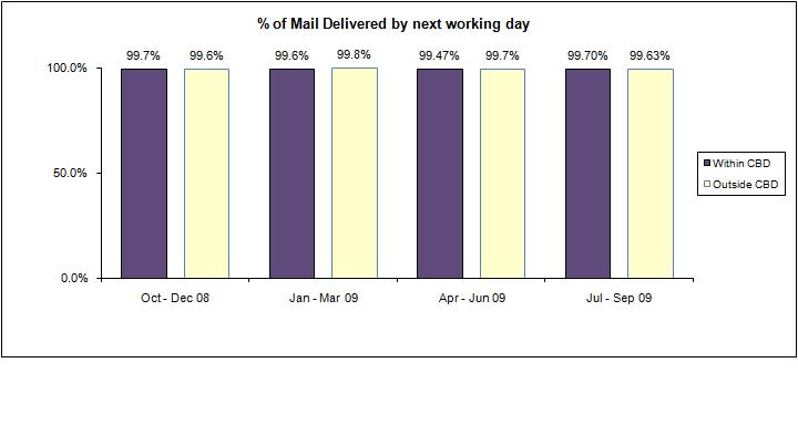 IDA's requirement: % of mail delivered within CBD areas by next working day - 99%