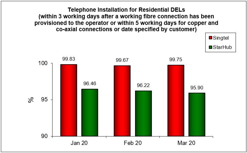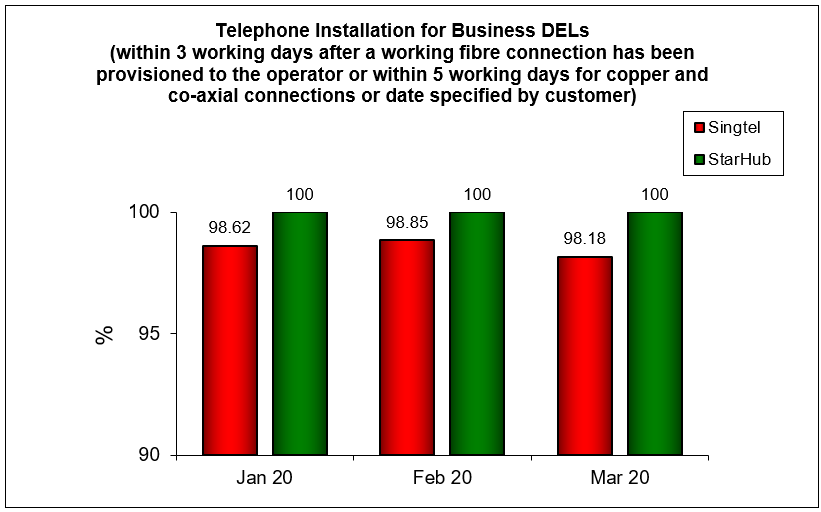 Results are rounded off to two decimal places. Therefore, a result of “100%” does not necessarily reflect that all DELs were installed within 3 working days after a working fibre connection has been provisioned to the operator or within 5 working days for copper and co-axial connections or date specified by customers in that month.