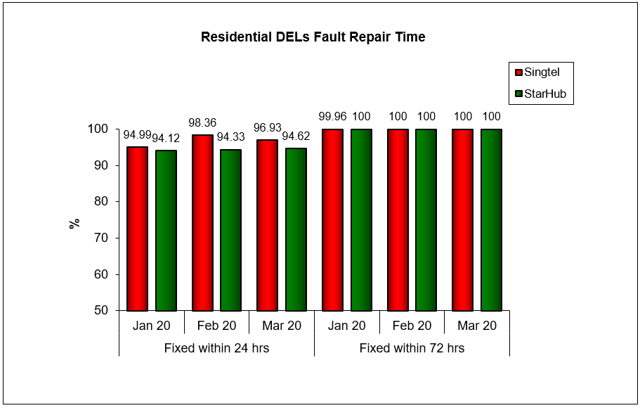 Results are rounded off to two decimal places. Therefore, a result of “100%” does not necessarily reflect that all faults were repaired within 24 hrs or 72 hrs in that month.