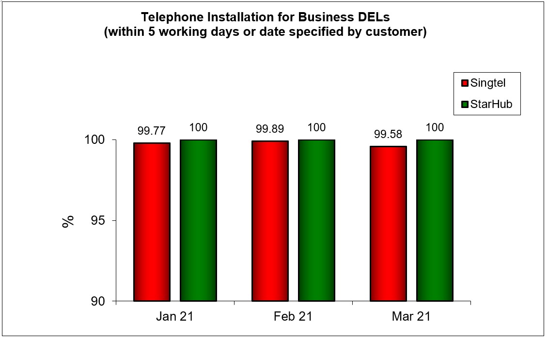 Results are rounded off to two decimal places. Therefore, a result of “100%” does not necessarily reflect that all DELs were installed within 3 working days after a working fibre connection has been provisioned to the operator or within 5 working days for copper and co-axial connections or date specified by customers in that month.
