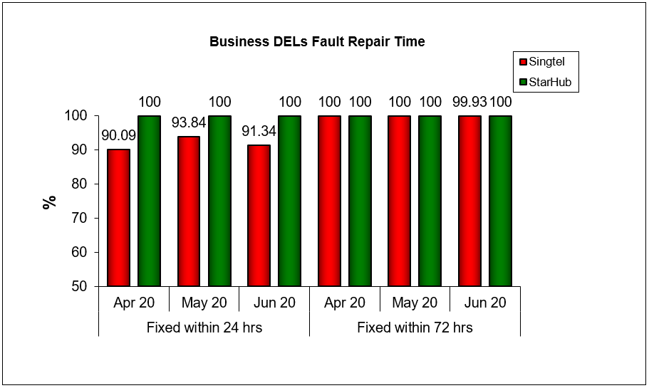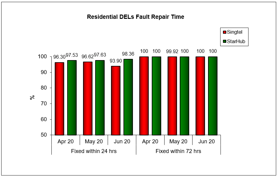Results are rounded off to two decimal places. Therefore, a result of “100%” does not necessarily reflect that all faults were repaired within 24 hrs or 72 hrs in that month.