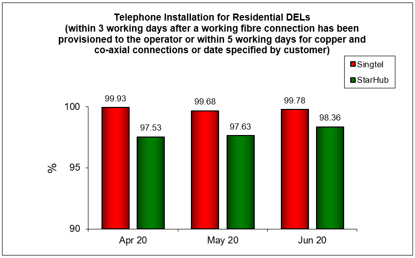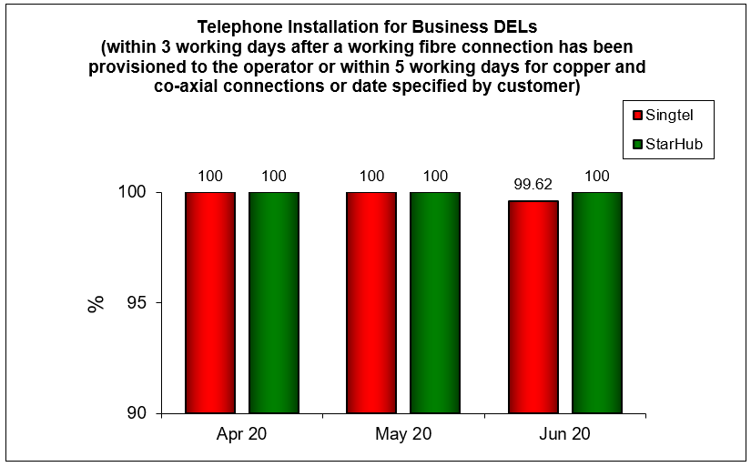 Results are rounded off to two decimal places. Therefore, a result of “100%” does not necessarily reflect that all DELs were installed within 3 working days after a working fibre connection has been provisioned to the operator or within 5 working days for copper and co-axial connections or date specified by customers in that month.