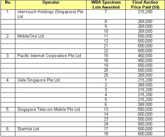 At the close of the Wireless Broadband Spectrum Rights Auction on 24 May 2005, the following WBA Spectrum Lots were awarded to the successful Bidders: